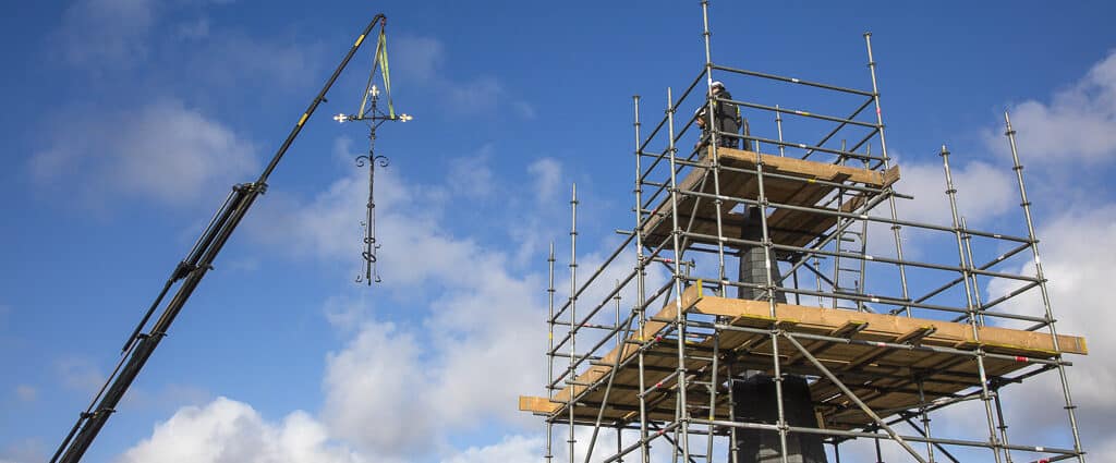 De buitenkant van de kerk is bijna klaar. Geleidelijk aan verdwijnen de steigers en wordt de kerk weer volledig zichtbaar. De kerk is er mooier op geworden. De lelijke regenpijpen zijn weggewerkt, de muren zijn schoon gemaakt en de originele kleuren in het schilderwerk aangebracht.