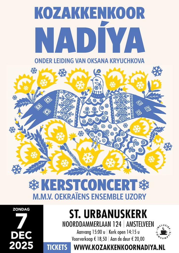 St. Urbanuskerk Bovenkerk Noorddammerlaan 126, Amstelveen, Noord-Holland, NederlandKozakkenkoor Nadiya kerstconcert 7 december 2025 te Amstelveen-Bovenkerk Het Kozakkenkoor Nadya onder leiding van de van oorsprong Oekraïense dirigent Oksana Kryuchkova, geeft hun kerstconcert op zondag 7 december 2025 in de mooie Sint Urbanuskerk aan de Noorddammerlaan 124, 1187 AG Amstelveen (Bovenkerk). De